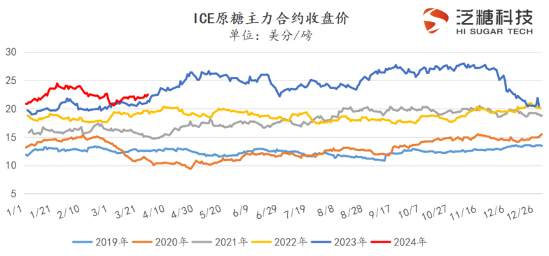 ICE原糖主力合约3月价格区间为20.53~22.59美分/磅,月末收盘价为22.51美分/磅,较上月末上涨0.81美分/磅,涨幅3.73%。