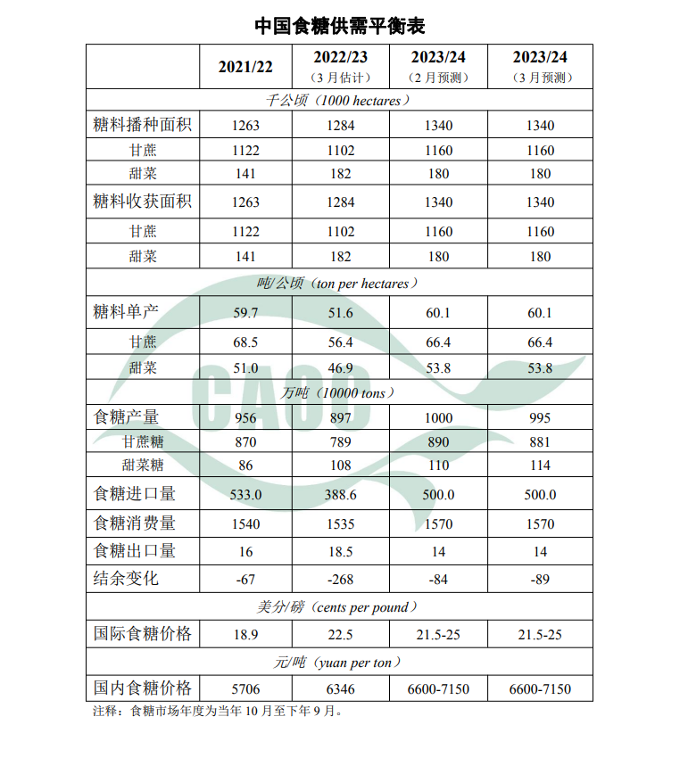 截至3月末,国内产区制糖集团报价区间为6470~6710元/吨,环比上月上涨60~200元/吨;广西白糖现货成交价区间为6359~6598元/吨,月末价格6546元/吨,较上月末上涨150元/吨。