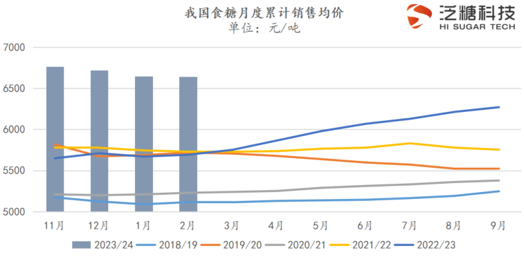 本制糖期全国制糖工业企业成品白糖累计平均销售价格6639元/吨,同比回升947元/吨。2024年2月,成品白糖平均销售价格6562元/吨,同比回升808元/吨,环比上涨1元/吨。