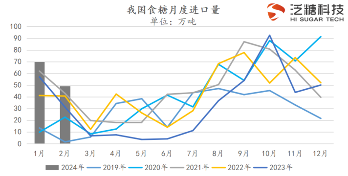 2024年1月份、2月份我国进口糖分别为70万吨、49万吨,同比上分别增加13.1万吨、17.83万吨;1-2月份我国累计进口糖119万吨,同比增加30.93万吨,增幅35.2%。