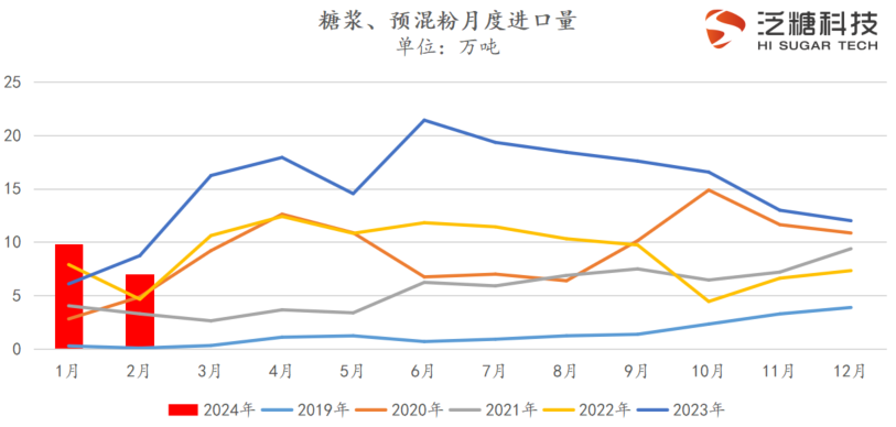 2023/24榨季截至2月,糖浆和预混粉共进口58.36万吨,同比增加25.16万吨,增幅75.76%。