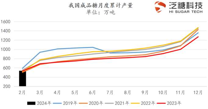截至2月底,2023/24年制糖期共生产食糖794.79万吨,同比增加3.48万吨;累计销售食糖377.85万吨,同比增加41.37万吨;累计销糖率47.54%,同比加快5个百分点。