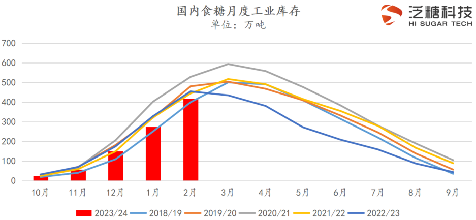 2023/24榨季截至2月底,全国月度累计工业库存416.94万吨,同比下降38.06万吨,降幅8.36%。