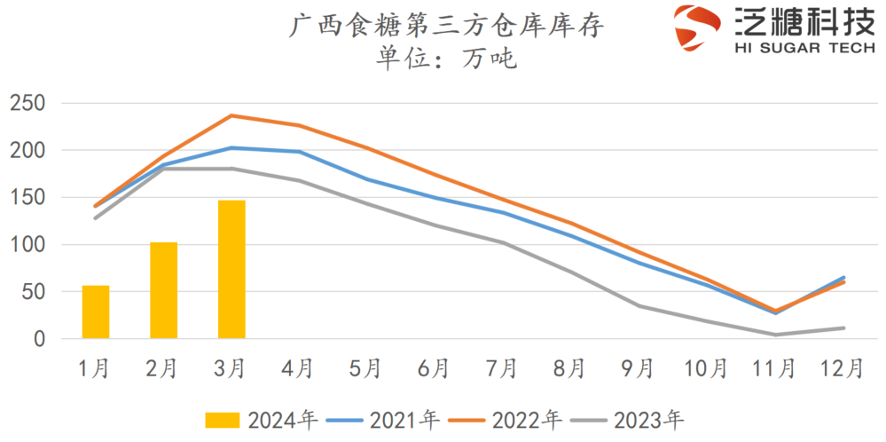 截至3月20日,广西食糖第三方仓库库存数量近150万吨,较去年同期减少约35万吨,持续近年来的最低水平。