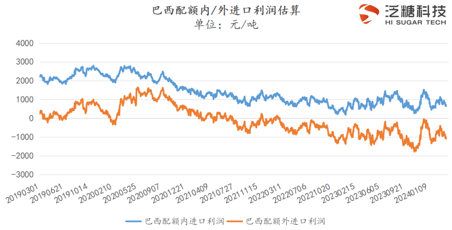 截至3月底,配额内进口的巴西糖加工完税成本约为6119元/吨,配额外加工完税成本约为7859元/吨,环比上月末分别上涨427元/吨557元/吨;相较国内沿海加工糖主流报价6820~7130元/吨,巴西配额外进口利润约为-1040~-730元/吨。