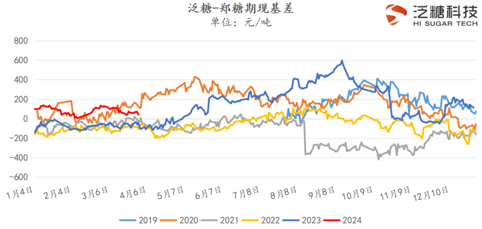 3月,国内白糖期现基差区间39~113元/吨,基差修复,呈走弱态势。
