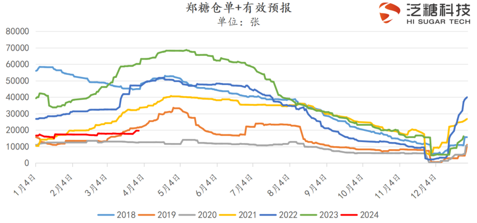 郑商所3月末的白糖注册仓单为19240张,环比增加2718张;有效预报312张,环比减少1006张。仓单+有效预报19552张,环比增加1712张;同比减少40637张,降幅67.52%。
