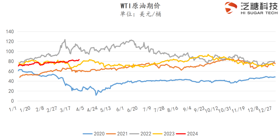 受缘扰动频繁,市场风险溢价回升,美国炼厂开工率有望持续回升,终端消费需求强劲,叠加宏观上美联储预期降息升温,本月油价重心逐步抬升,WTI原油3月月度价格区间为76.8~83.49美元/桶,月末价格83.49美元/桶,环比上涨5.21美元/桶,月涨幅6.66%。