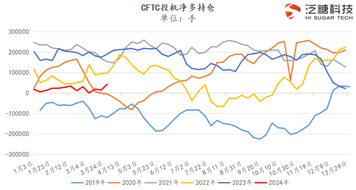 截至3月26日当周,ICE原糖期货+期权总持仓为1010825手,较前一周增加4648手。投机多头持仓171455手,较前一周增加19192手;投机空头持仓129190手,较前一周减少8377手;投机净多持仓为42265手,较前一周增加27569手。