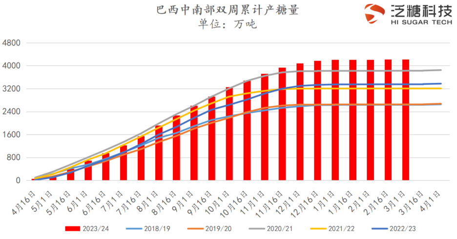 2023/24榨季截至2月下半月,巴西中南部地区累计入榨量为64714.8万吨,同比增加10386.4万吨,增幅达19.12%;甘蔗ATR为139.55kg/吨,同比下降1.59kg/吨;累计制糖比为49.02%,同比增加3.08%;累计产乙醇327.04亿升,同比增加44.34亿升,增幅15.68%;累计产糖量为4218.1万吨,同比增加861.4万吨,增幅达25.66%。