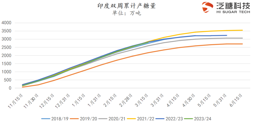 2023/24榨季截至2月底,印度尚有466家糖厂开榨,同比增加19家;产糖量为2553.8万吨,同比下降31万吨,降幅1.20%。