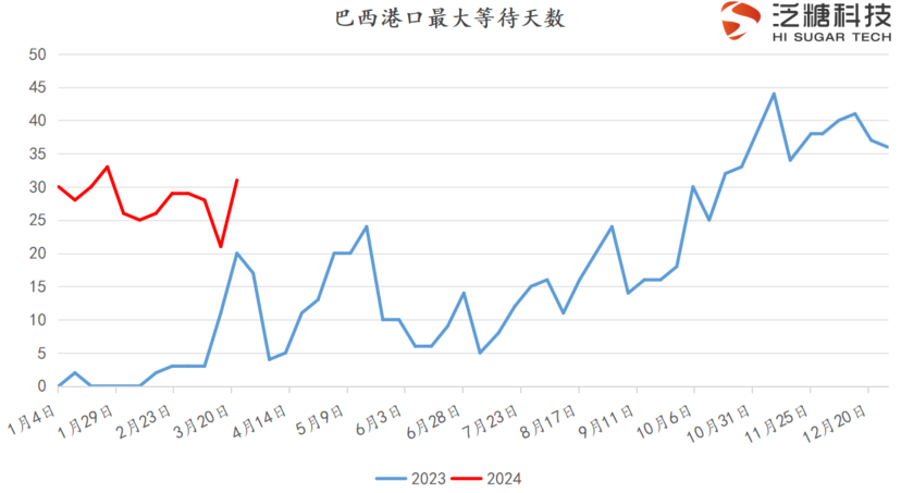 巴西食糖发运量维持高位,堵港天数有所上升。据巴西航运机构Williams发布的数据显示,截至3月20日当周,巴西港口等待装运食糖的船只数量为57艘,等待装运的食糖数量为210.93万吨,港口最大等待天数为31天,较上周的21天大幅上升。