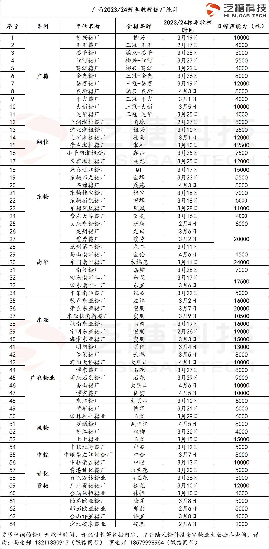 广西2023/24榨季开榨糖厂合计74家,截至4月7日累计收榨糖厂64家,合计日榨蔗能力约53.9万吨,同比分别减少8家、4.75万吨;剩余10家糖厂未收榨,合计日榨蔗能力约5.1万吨。