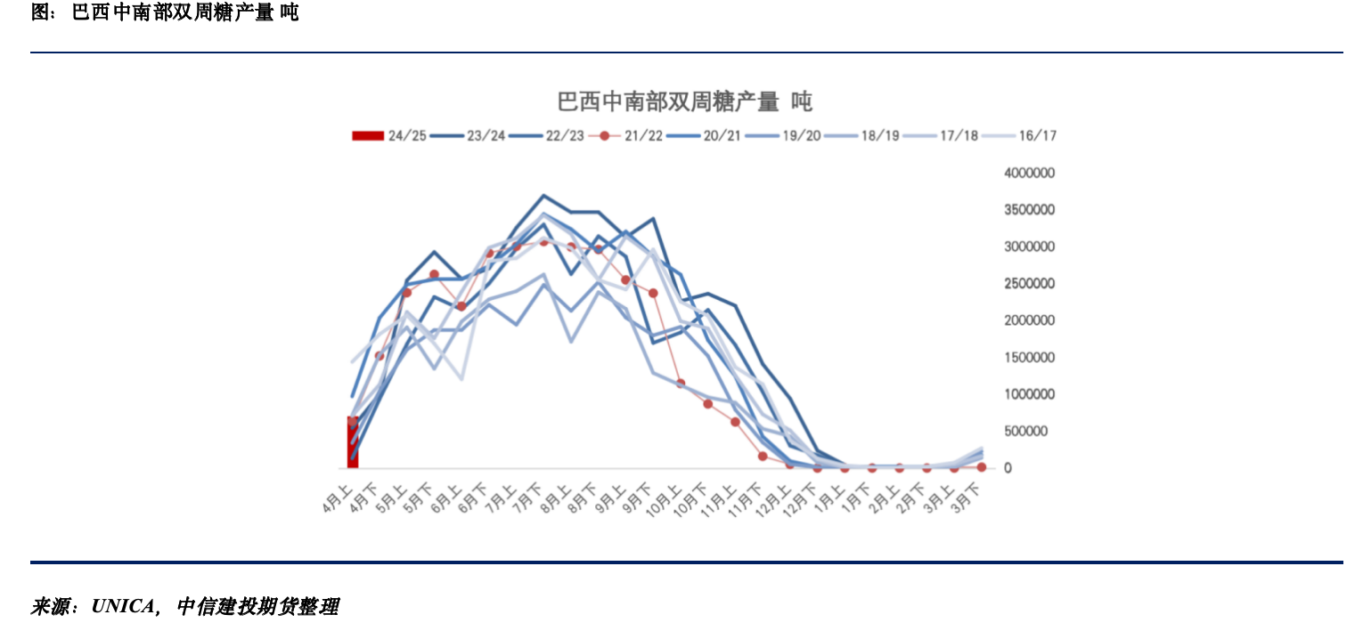 降雨的影响预计在4月下旬开始有所缓解,但如果干旱持续对于整个榨季的糖产量或不利。根据天气模型的数据显示,从4月下旬至5月上旬开始,巴西中南部蔗区降雨量整体呈现低于正常水平的状态,和2021年的水平相似。以21/22榨季为参考,整个榨季的降雨持续性的偏少,榨季前半期时,由于偏低的降雨利于糖厂的生产进度,从双周数据来看双周糖产量都是在同期偏高的水平,但是越往后期,持续性的干旱导致双周食糖产量快速下滑,最终中南部产量为约3207万吨,同比减少约600万吨,因此需要关注后期巴西的干旱情况是否持续甚至恶化。