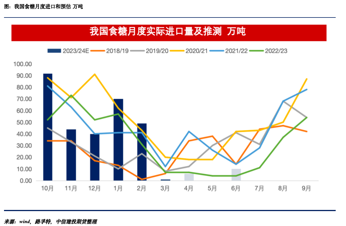 此外由于此前进口利润窗口持续关闭,从当前所知的船报数据角度,未来3个月进口量预计偏少,每个月的进口量均在10万吨一下,甚至部分月份低于5万吨,港口的进口糖现货紧张。