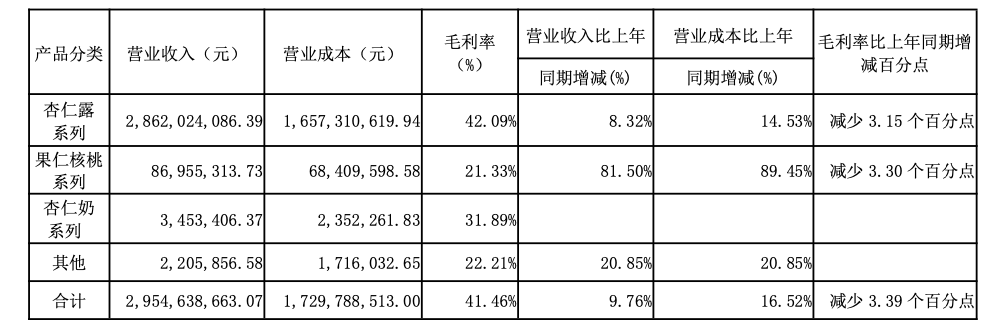 从产品来看,杏仁露产品是承德露露的主要收入来源,2023年营收为28.62亿元,同比增长8.32%,占总营收的96.87%。果仁核桃露产品营收为8695.53万元,同比增长81.5%,占总营收的2.94%。
