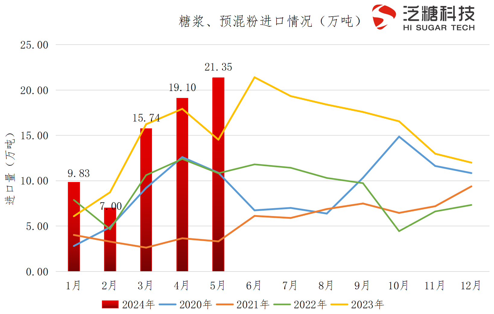 2024年5月我国进口糖浆和预拌粉21.35万吨,同比增加6.83万吨
