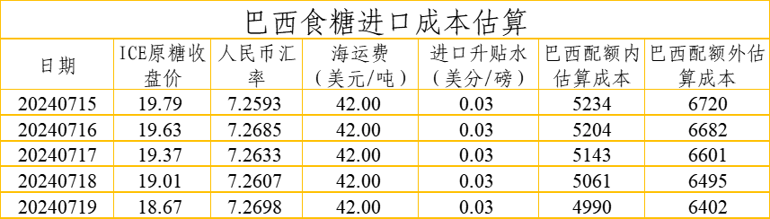 2024年7月19日,ICE原糖收盘价为18.67美分/磅,人民币汇率为7.2698。经测算,配额内巴西糖加工完税估算成本为4990元/吨,配额外巴西糖加工完税估算成本为6402元/吨;与日照白糖现货价比,配额内巴西糖加工完税估算利润为1560元/吨,配额外巴西糖加工完税估算利润为148元/吨。