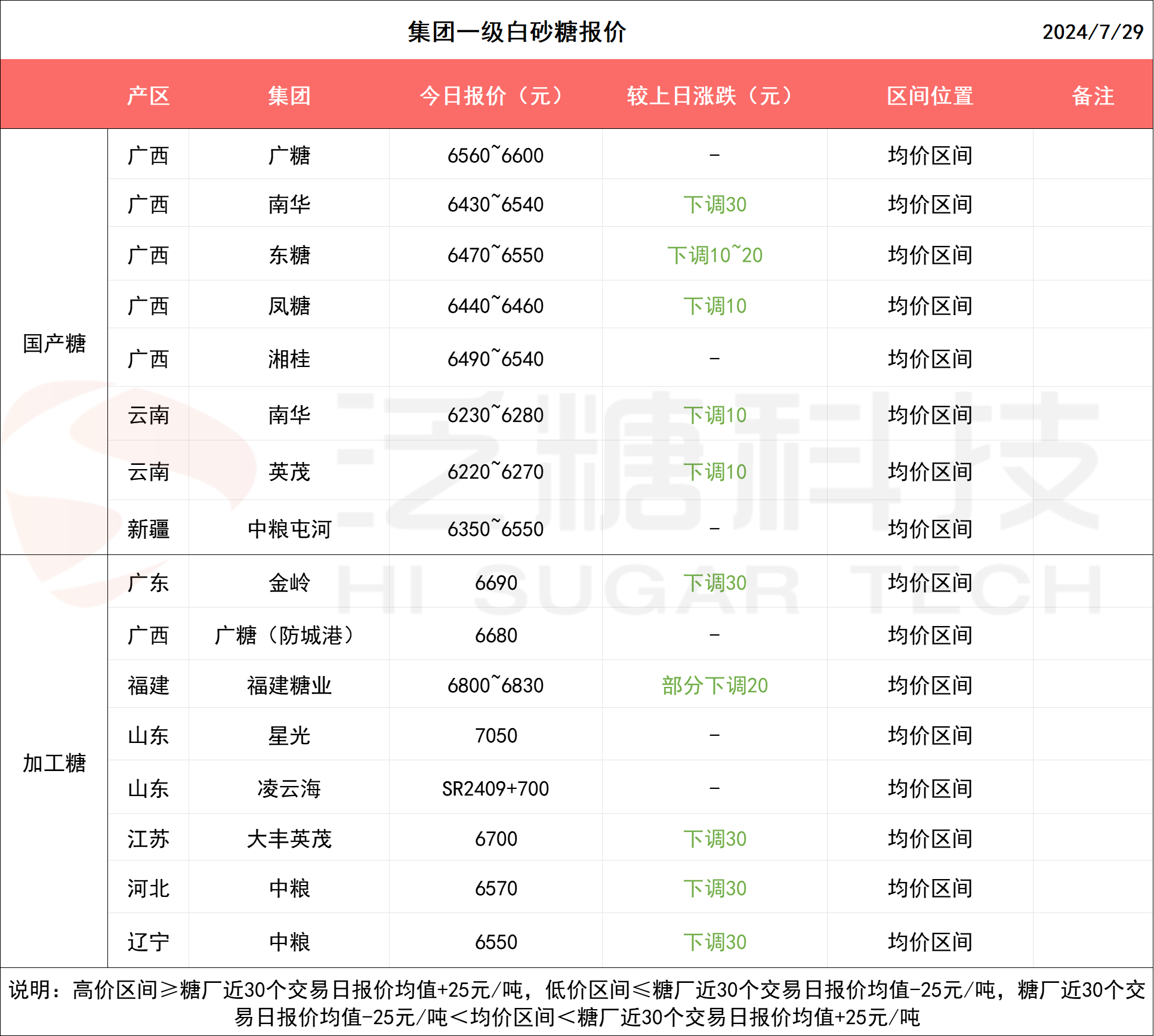 今日广西白糖现货成交价为6360元/吨,下跌34元/吨;广西制糖集团报价区间为6430~6600元/吨,下调10~30元/吨;云南制糖集团报价区间为6220~6280元/吨,下调10元/吨;加工糖厂主流报价区间为6550~6830元/吨,部分下调10~30元/吨。中秋传统消费旺季逐渐开启,销区低库存终端和贸易商询价次数增多,现货交投氛围略好。