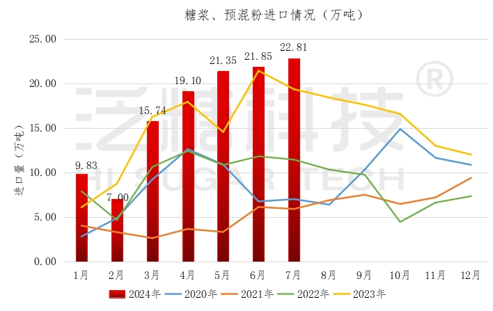 2024年7月我国进口糖浆、白砂糖预混粉22.81万吨,创历史新高