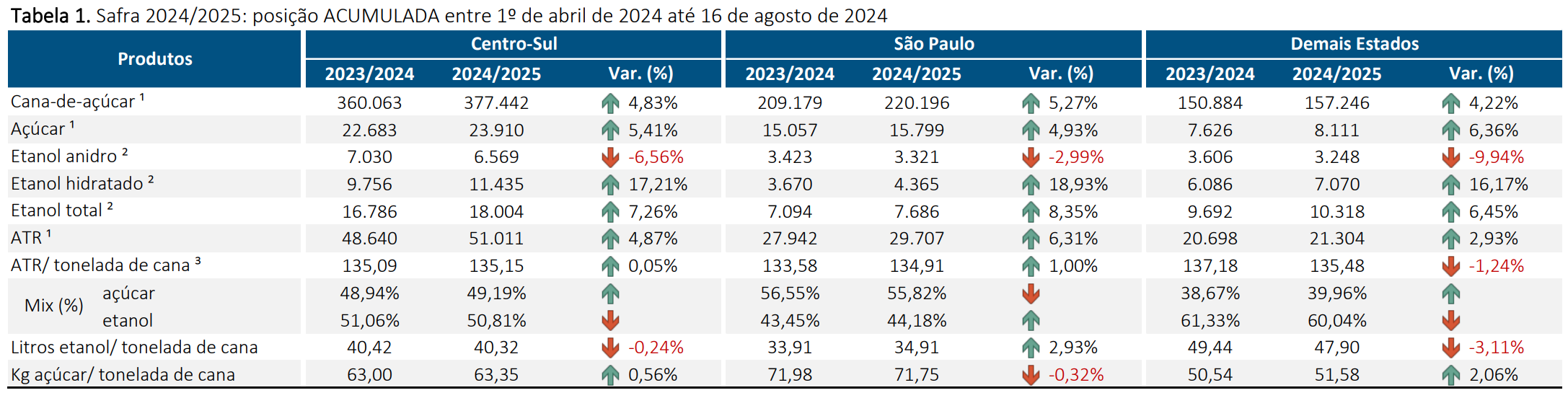 2024/25榨季截至8月上半月,巴西中南部地区累计入榨量为37744.2万吨,较去年同期的36006.3万吨增加1737.9万吨,同比增幅达4.83%;甘蔗ATR为135.15kg/吨,较去年同期的135.09kg/吨增加0.06kg/吨;累计制糖比为49.19%,较去年同期的48.94%增加0.25%;累计产乙醇180.04亿升,较去年同期的167.68亿升增加12.36亿升,同比增幅达7.26%;累计产糖量为2391万吨,较去年同期的2268.3万吨增加122.7万吨,同比增幅达5.41%。