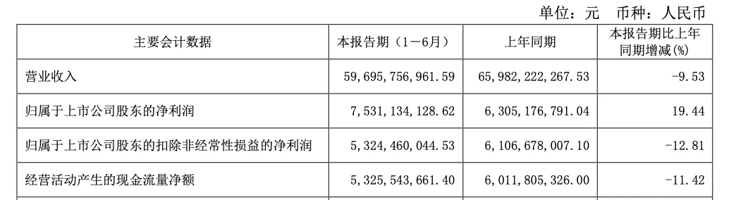 上半年,伊利实现营业总收入599.15亿元,同比下降9.53%;归属于上市公司股东的净利润75.31亿元,同比增长19.44%。