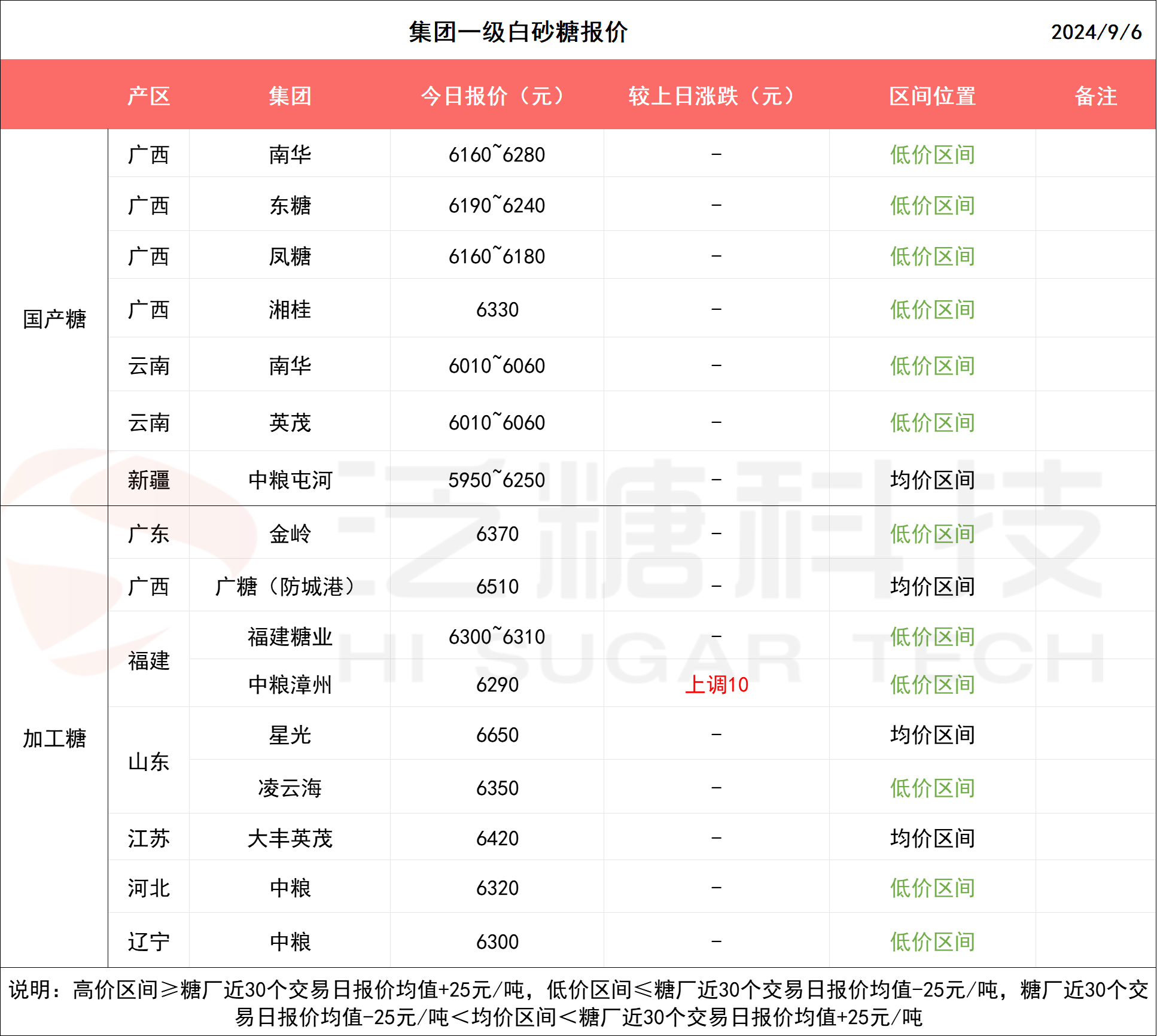 加工糖厂主流报价区间为6290~6420元/吨,中粮漳州上调10元/吨。
