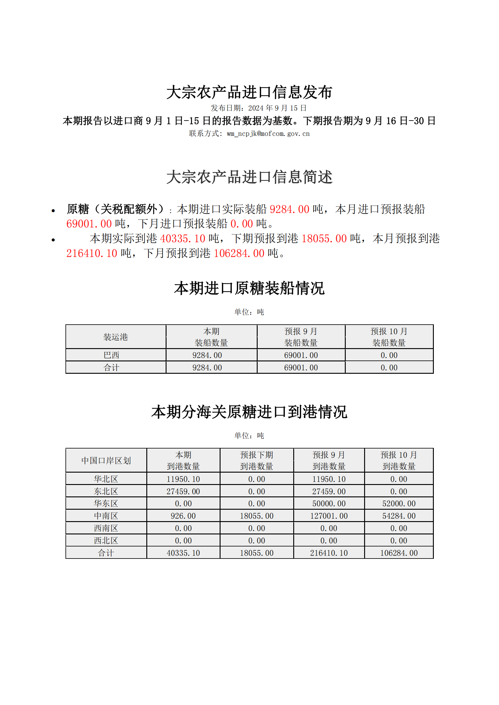 商务部:2024年9月上半月关税配额外原糖实际到港4.03万吨,9月预报到港21.64万吨