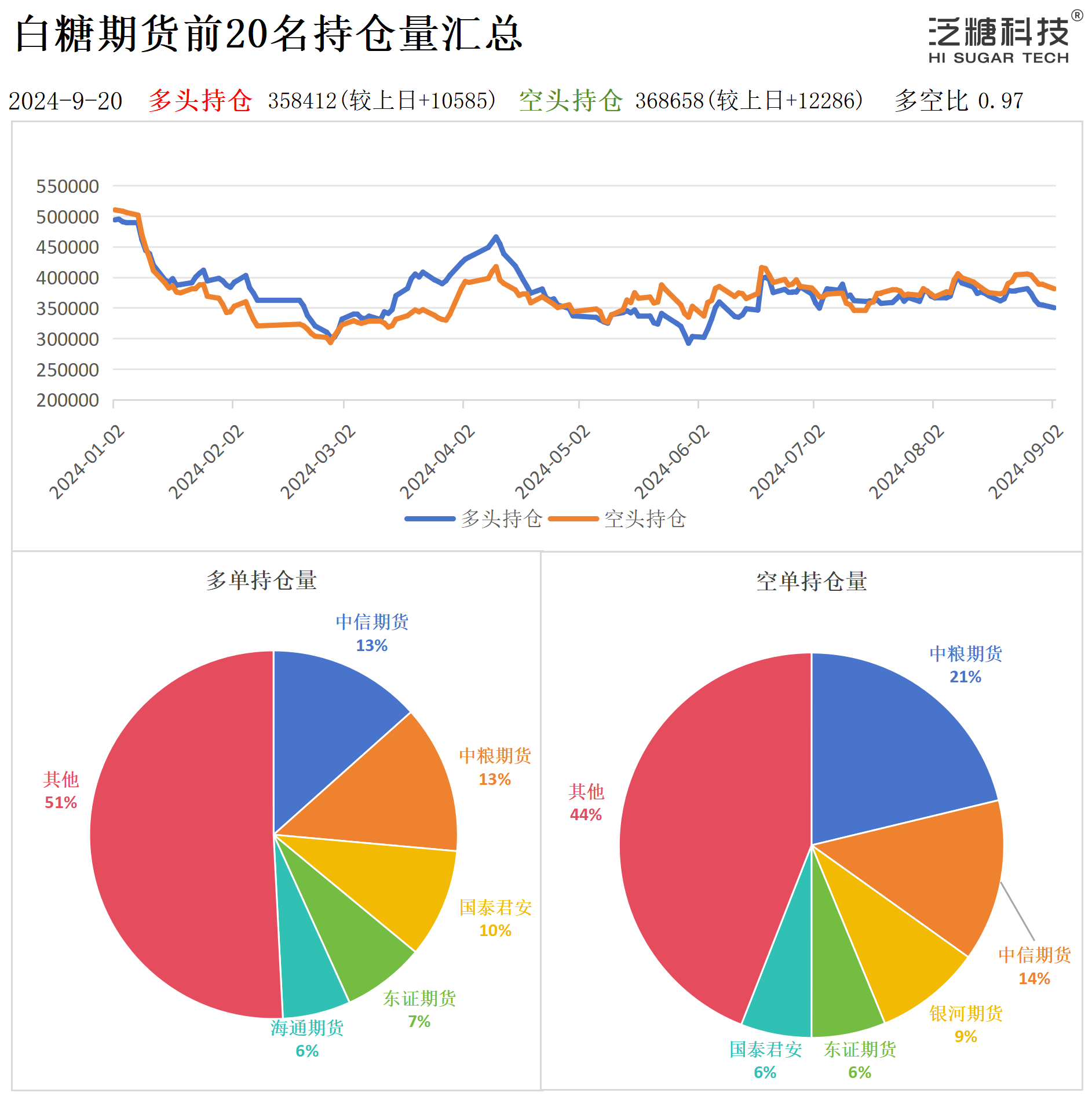 2024年9月20日,郑商所白糖期货前20名多头持仓为368658手,较上一交易日增加10585手;前20名空头持仓为358601手,较上一交易日增加12286手,多空比为0.97,主要机构具体持仓结构如下: