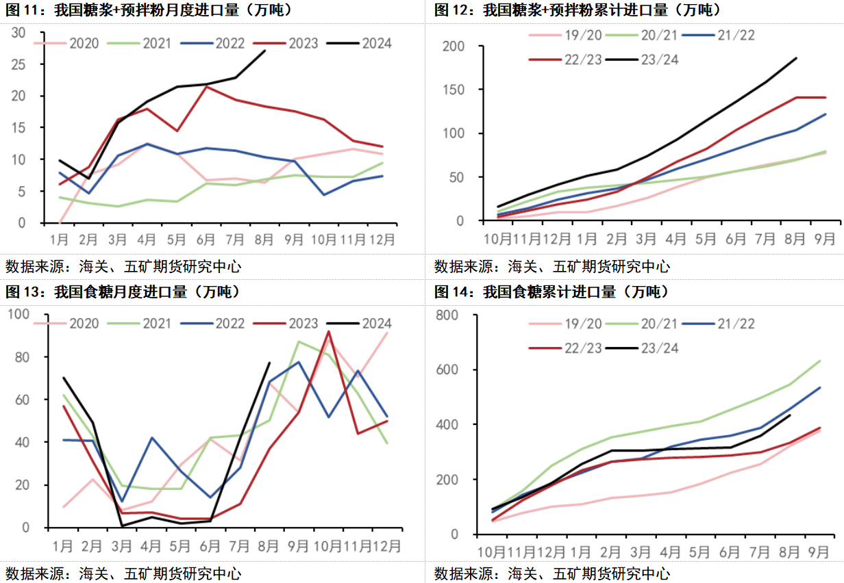 9月下旬以来郑糖价格跟随外盘反弹,截至9月30日郑糖1月合约收盘价报5915元/吨,较之前一月上涨263元/吨,或4.65%,但外盘涨幅远高于国内,主要原因是进口大量到港以及市场对新榨季国内增产预期感到担忧。据海关总署公布的数据显示,2024年8月份我国进口食糖77万吨,同比增加40.40万吨,增幅110.41%。2024年1-8月我国累计进口食糖249.39万吨,同比增加91.95万吨,增幅58.41%。2023/24榨季截至8月底,我国累计进口食糖435.38万吨,同比增加100.82万吨,增幅30.13%。8月份我国进口糖浆和预混粉合计27.12万吨,同比增加8.62万。2024年1-8月我国进口糖浆及预混粉合计145.11万吨,同比增加21.24万吨。2023/24榨季截至8月底我国进口糖浆及预混粉合计186.74万吨司比增加44.02万吨。