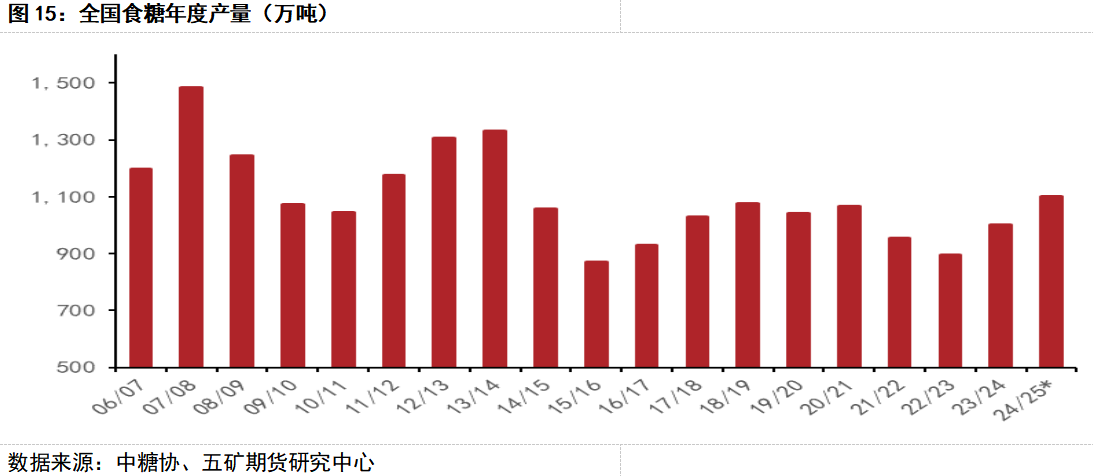 9月广西、广东、海南等甘蔗主产区受台风“摩羯”影响,局地甘蔗倒伏、折断,但总体影响并不大。就目前而言,南宁、崇左地区受台风影响甘蔗单产略微偏低,但也跟去年同期持平。桂北地区如柳州、来宾甘蔗单产水平是高于去年。广西各集团预计甘蔗种植面积增幅都在10-20%,因此广西增产幅度可能会比较大。其余产区方面,2024/25榨季新疆糖产量有望创新高,从56万吨大增至70万吨以上。内蒙古糖产量预计从上榨季的54万吨提高至65-70万吨左右。预计2024/25榨季全国食糖产量将达到1100-1150万吨,同比增加104-154万吨。