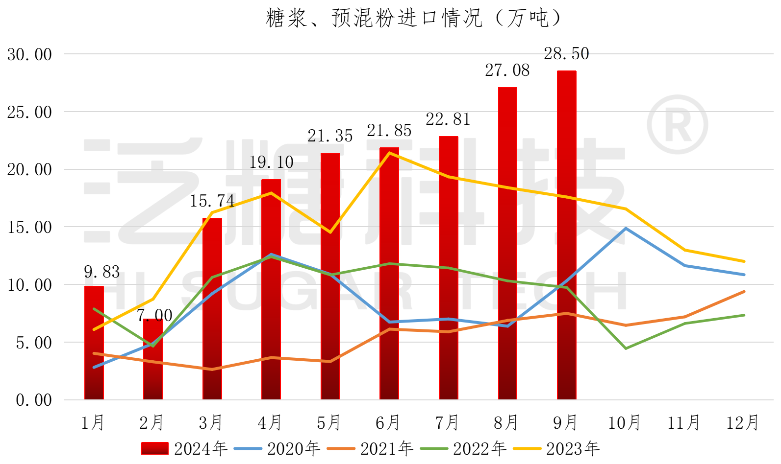 据海关总署数据,9月我国进口糖浆、白砂糖预混粉(税则号列170290)28.50万吨,同比增加10.92万吨,增幅62.09%。