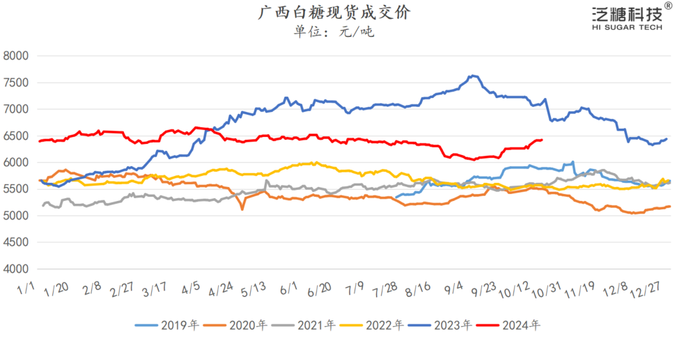 截至周五,广西制糖集团报价区间为6510~6600元/吨,部分上调20~40元/吨;云南制糖集团报价为6270~6340元/吨,周环比上调50~70元/吨;加工糖厂主流报价区间为6580~6790元/吨,部分周环比上调20~60元/吨。