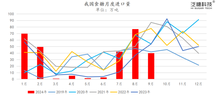 2024年9月份我国进口食糖40.37万吨,同比下降13.52万吨,降幅25.09%;2024年1-9月我国累计进口食糖289.48万吨,同比增加78.16万吨,增幅36.98%。