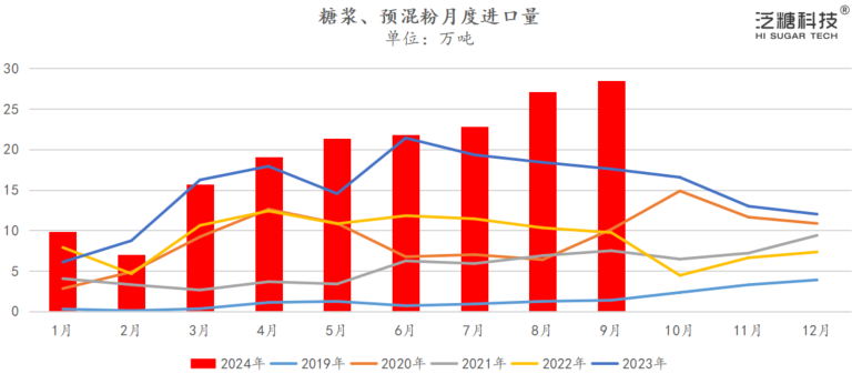 9月我国进口糖浆、白砂糖预混粉(税则号列170290)28.50万吨,同比增加10.92万吨,增幅62.09%;2024年1-9月份累计进口173.26万吨,同比增长33.04万吨,增幅23.57%。