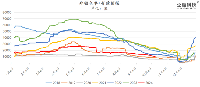 数据来源:泛糖科技 期货市场 郑糖SR2501合约周度运行区间为5825~5973元/吨,周五收于5866元/吨,环比下跌51元/吨,跌幅0.86%,成交较上周明显缩量,总体呈下行态势。 现阶段国内糖市供需矛盾尚不显著,期价上行动能不显。周三,受外盘上涨提振,期价直线拉涨至5970元/吨上方,为产业套保提供了良好机会,压力渐显。此外,9月糖浆和预混粉进口同比增加10.92万吨至28.5万吨,再度刷新月度进口记录,给市场造成较大心理压力。外盘坚挺,而国产糖增产预期强烈,多空信息交织,市场缺乏明确方向性指引,短期或以弱势运行为主。 数据来源:郑商所