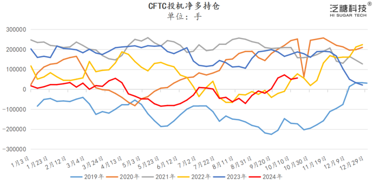 截至10月15日当周,ICE原糖期货+期权总持仓为993519手,较前一周增加2086手。投机多头持仓217536手,较前一周增加8136手;投机空头持仓161091手,较前一周增加1587手;投机净多持仓为56445手,较前一周增加6548手。