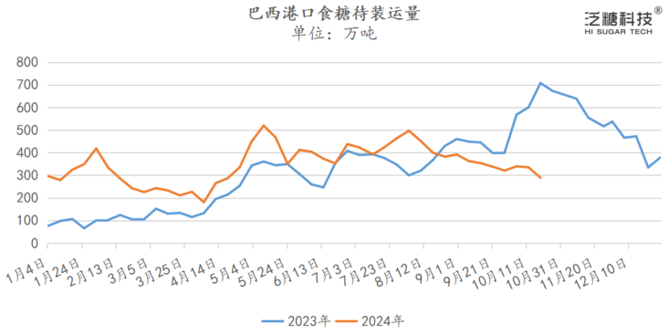 航运机构Williams发布的数据显示,截至10月16日当周,巴西港口等待装运食糖的船只数量为75艘,此前一周为80艘;港口等待装运的食糖数量为288.64万吨(高级原糖数量为270.26万吨),此前一周为344.89万吨,环比减少56.25万吨,降幅16.31%。其中桑托斯港等待出口的食糖数量为189.95万吨,帕拉纳瓜港等待出口的食糖数量为48.4万吨。