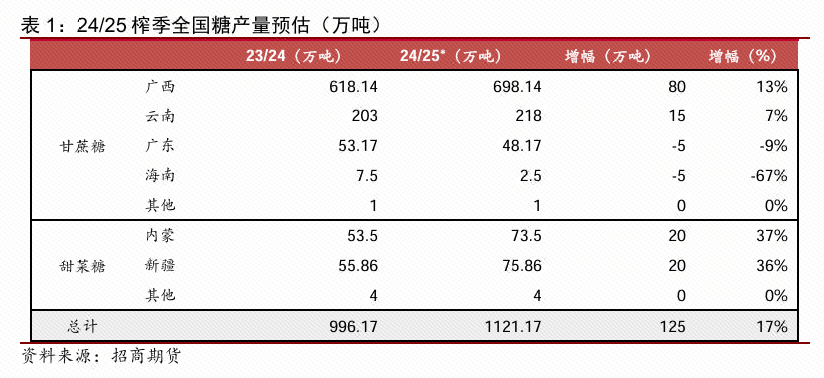 24/25榨季全国糖产量预估为1100-1120万吨。北方甜菜糖增产40万吨,广西糖增80万吨,云南糖增15万吨,广东和海南因受到台风影响糖产量减少10万吨,综合全国预计增产125万吨,增幅17%。