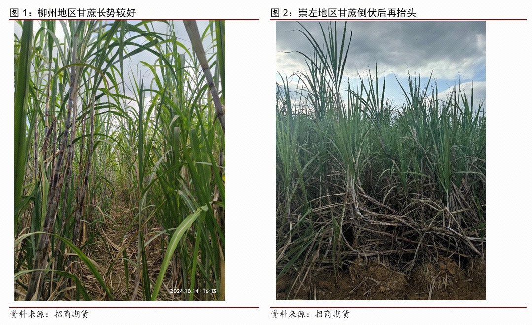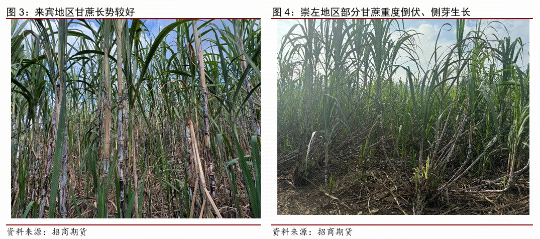 4) 台风影响有限,主要发生在崇左地区:今年台风“摩羯”过境,从影响面积上,崇左甘蔗倒伏比例80-90%,重度倒伏20%,中度和轻度倒伏占比80%。影响评估:重度倒伏的甘蔗单产和糖分会受到影响,中度和轻度甘蔗后期生长可修复。可能会存在不生长而糖分累积较快(成熟度高后未能及时入榨而导致退糖)、侧芽生长吸收养分、蒲心以及田间鼠害等情况。对于造成单产下降的具体数值难以评估,影响0.2吨/亩-1吨/亩不等,还需持续关注后期田间管理以及甘蔗恢复的情况。