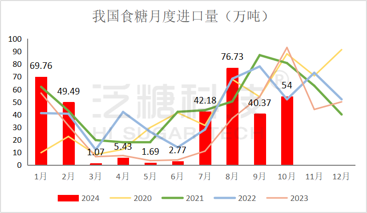 2024年10月份我国进口食糖54万吨,同比减少38.48万吨
