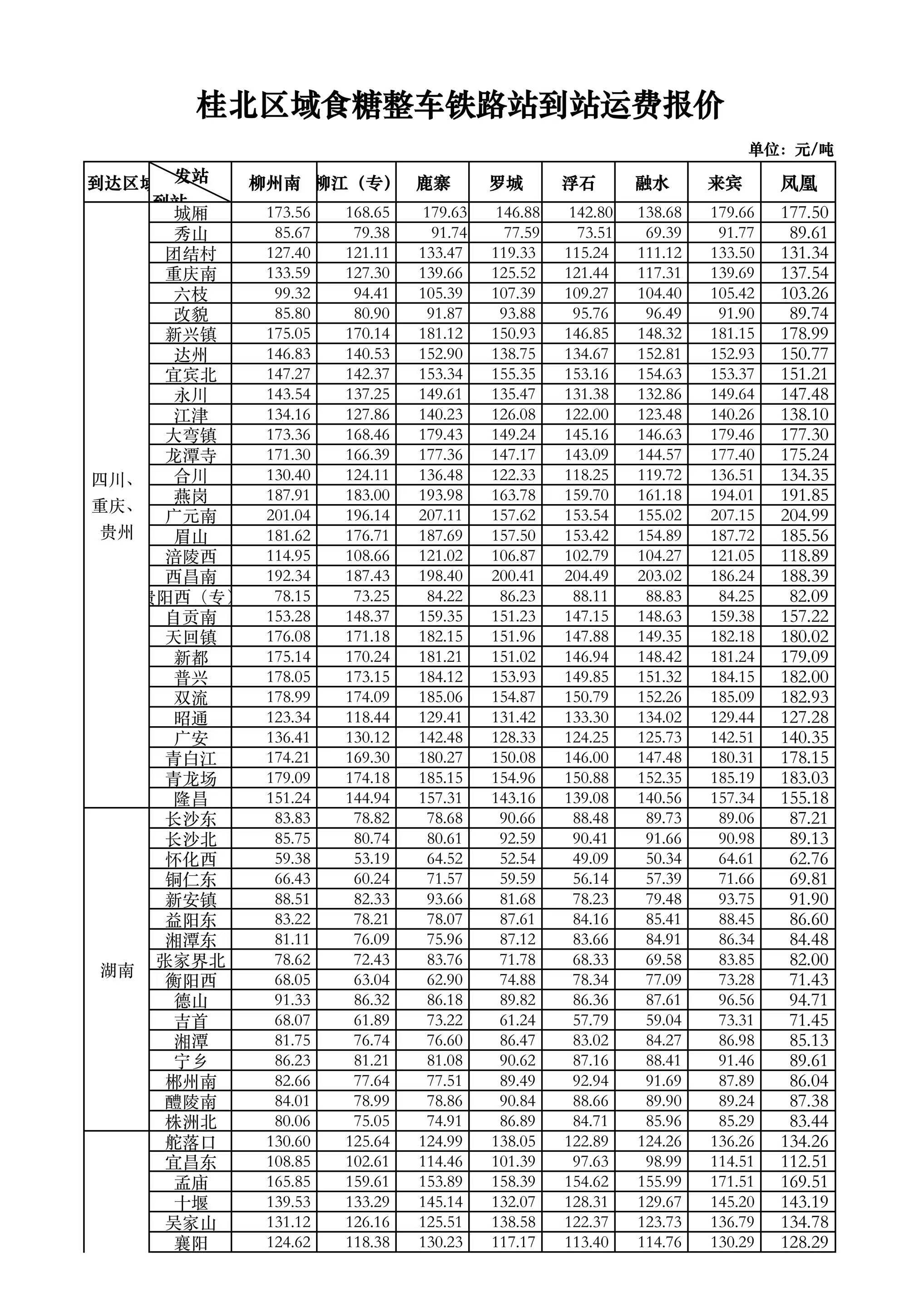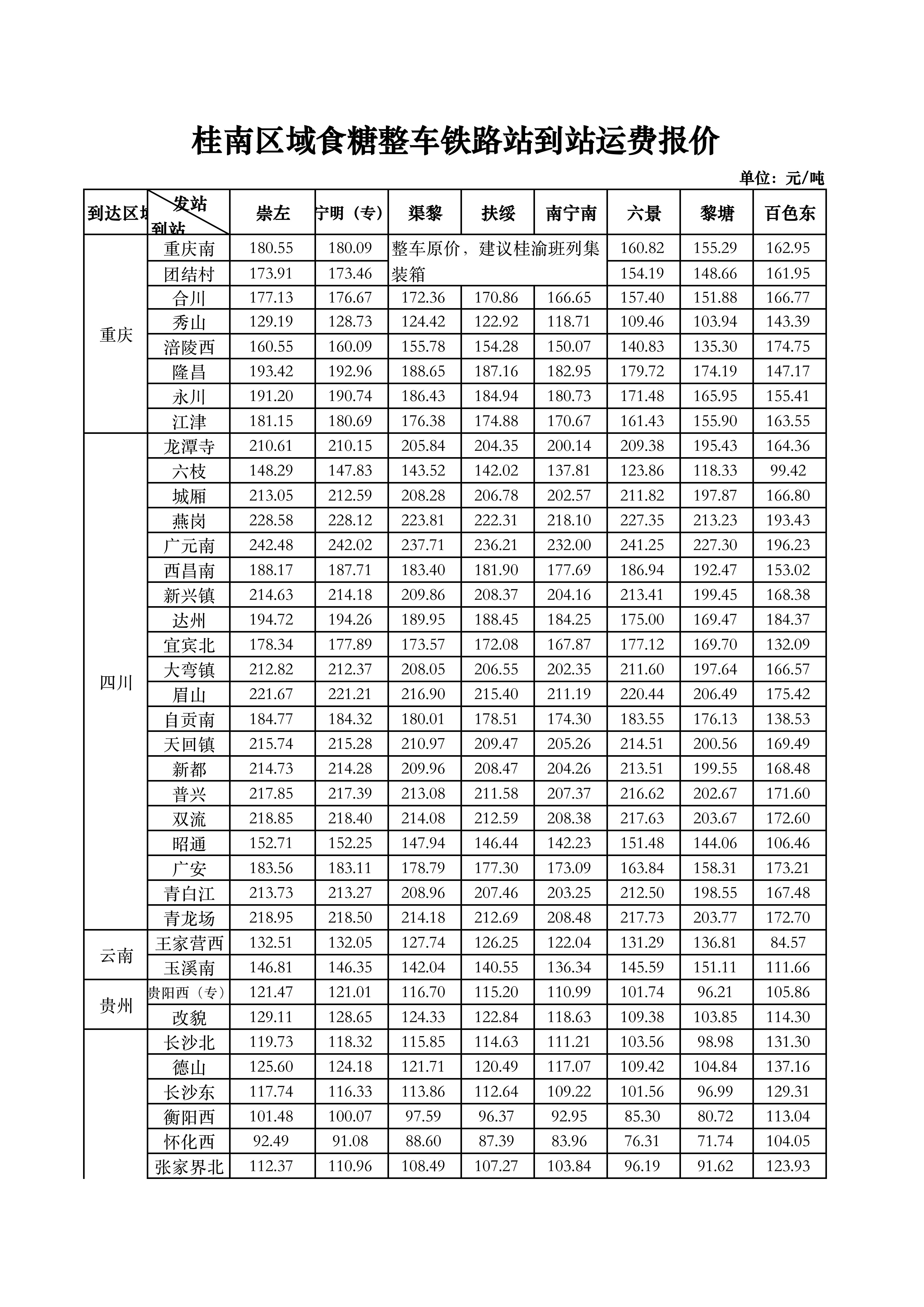 如有食糖整车运输需求,请联系中国铁路南宁局集团有限公司相关业务办理联系人,具体站点价格详见附件《广西食糖铁路运费报价》。