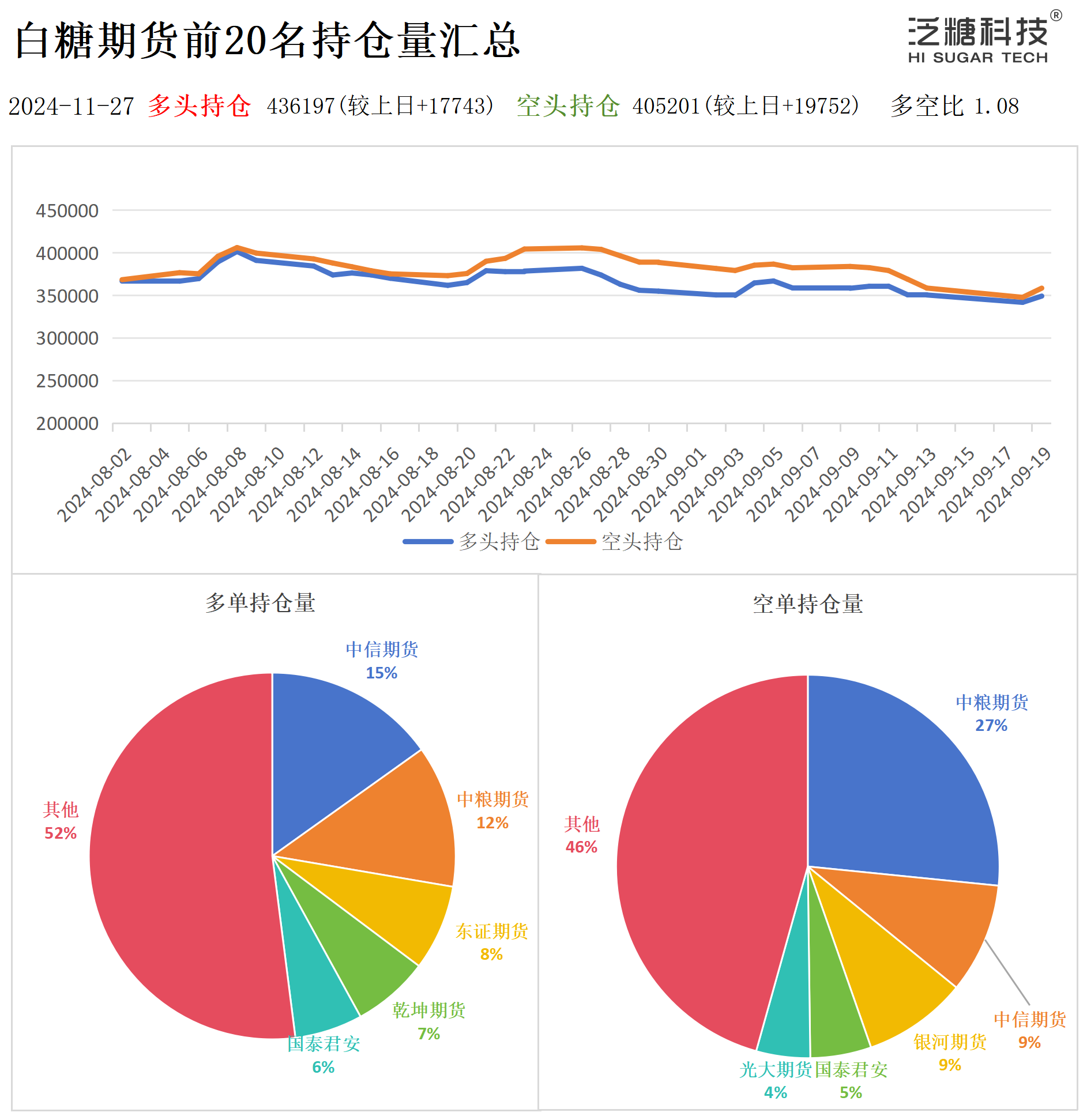 2024年11月27日,郑商所白糖期货前20名多头持仓为436197手,较上一交易日增加17743手;前20名空头持仓为405201手,较上一交易日增加19752手,多空比为1.08。主要机构具体持仓结构如下: