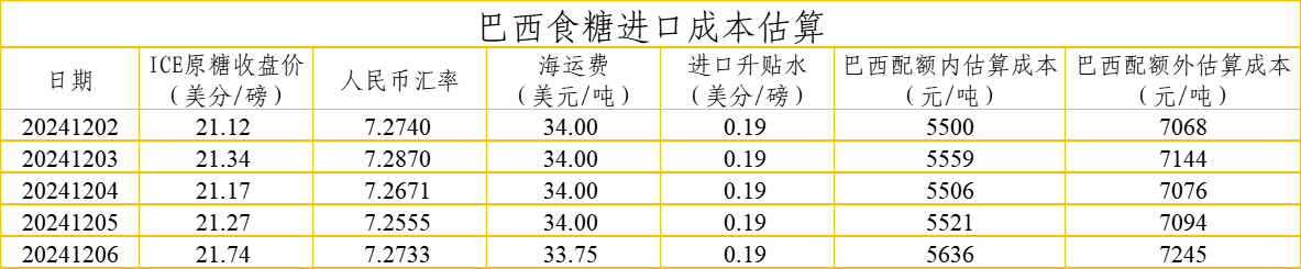 2024年12月6日,ICE原糖收盘价为21.74美分/磅,人民币汇率为7.2733。经测算,配额内巴西糖加工完税估算成本为5636元/吨,配额外巴西糖加工完税估算成本为7245元/吨;与日照白糖现货价比,配额内巴西糖加工完税估算利润为743元/吨,配额外巴西糖加工完税估算利润为-865元/吨。