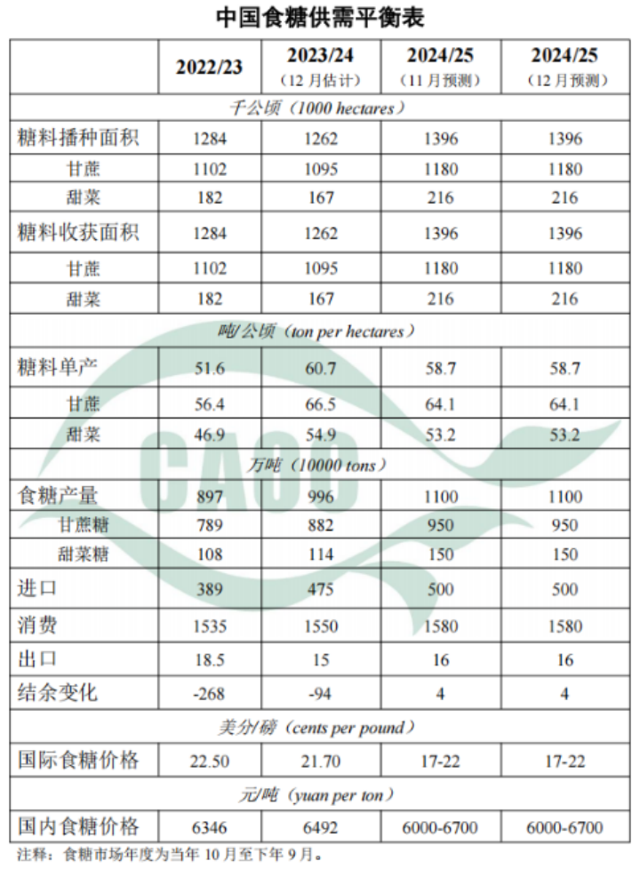 (一)2024年12月中国食糖供需形势分析