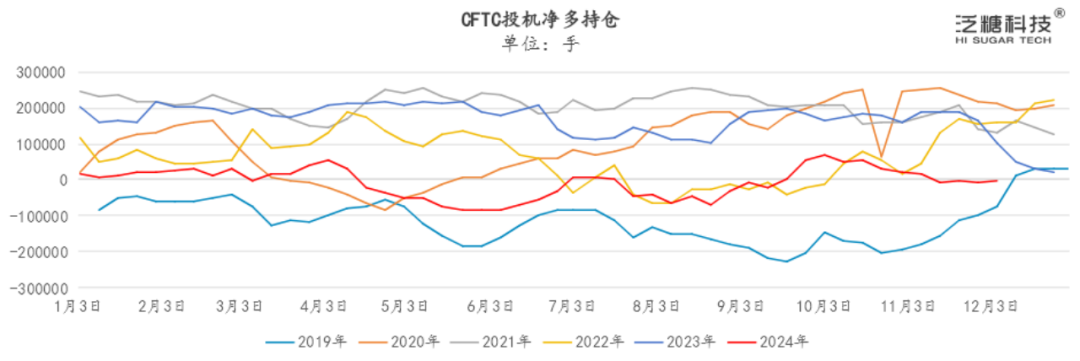 截至12月10日当周,ICE原糖期货+期权总持仓为1078053手,较前一周增加36446手。投机多头持仓189447手,较前一周增加2720手;投机空头持仓187152手,较前一周增加363手;投机净多持仓为2295手,较上周增加2357手。