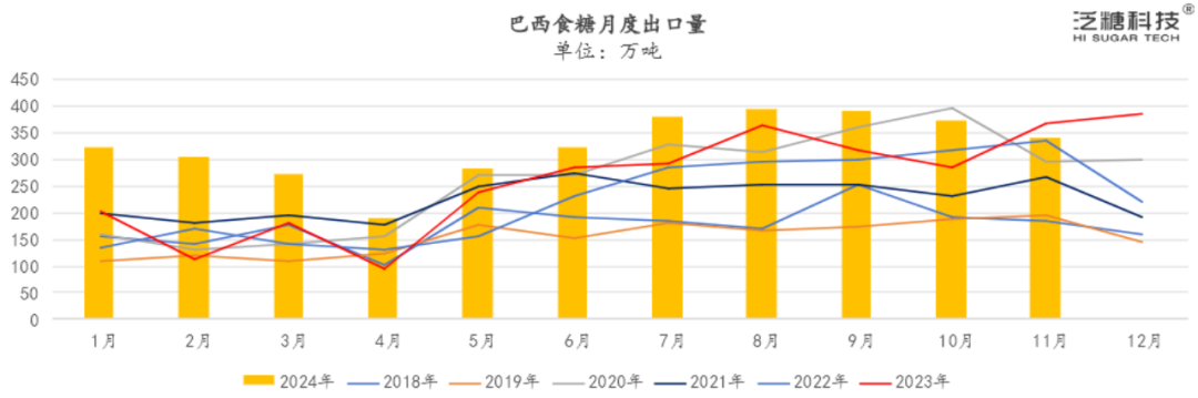 2024/25榨季截至11月下半月,巴西中南部地区累计入榨量为60294万吨,较去年同期减少1702.8万吨,同比降幅达2.75%;甘蔗ATR为141.72kg/吨,较去年同期增加1.44kg/吨;累计制糖比为48.34%,较去年同期减少1%;累计产糖量为3936.1万吨,较去年同期减少152.1万吨,同比降幅达3.72%。