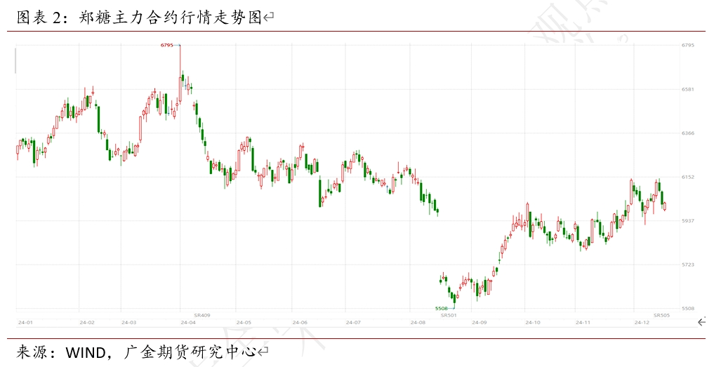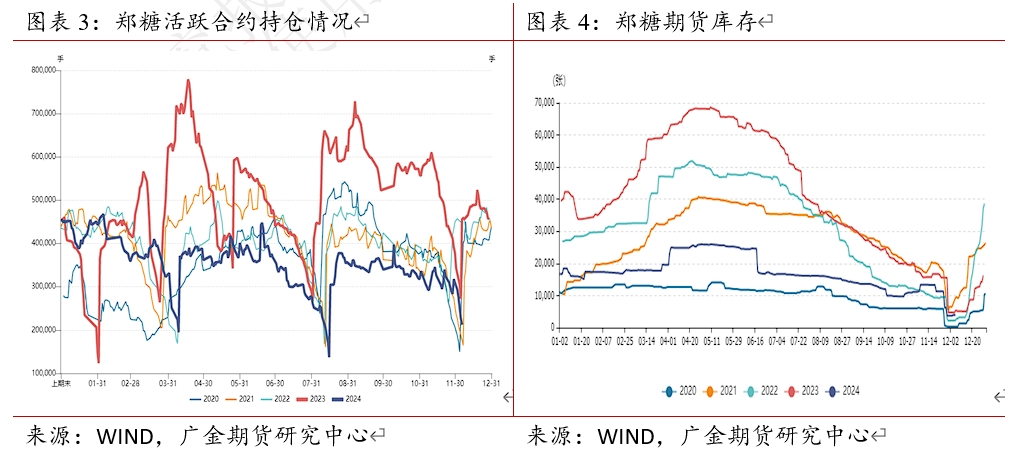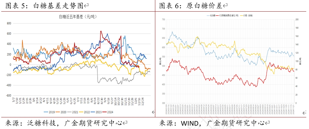 (2)国内郑糖1-3月份跟随原糖呈“N”型走势,4月份亦跟跌原糖,但在5月份的时候内外走势出现“劈叉”。5月份内强外弱,郑糖一直延续在5850上方窄幅区间震荡,直至6月中出现“跳水”下落,触及今年最低位置6000元/吨后快速企稳反弹。反弹原因在于6月份市场传出对进口糖浆、预拌粉的“管控”消息,提振盘面。随着三季度进口糖集中到港,以及新榨季(24/25榨季)的丰产预期,郑糖开启“熊市”周期。糖价一路下探至5500元/吨,由于结转库存偏低以及广西第三方库存历史极低值,下方受制糖成本和库存低的支撑。在新旧榨季转换之时,期货价格向现货价格靠拢。