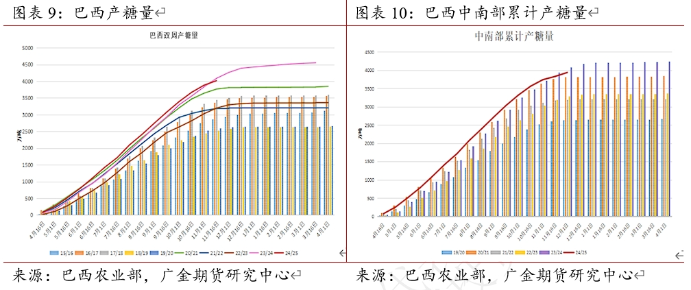 由于24/25榨季巴西糖厂投资扩大产能,且市场普遍预计 24/25 榨季巴西中南部制糖比偏高至52%左右的水平,以及现实是巴西在4月份开榨的24/25榨季产量数据强劲势头“崭露头角”,所以,巴西24/25榨季开篇即彰显“一哥”风范,导致市场看空意识较浓。
