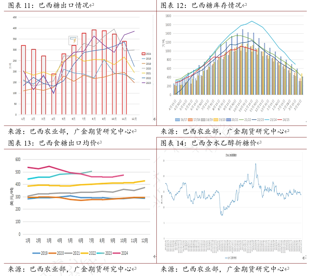 直到最新的产糖数据出炉,2024/25榨季截至11月下半月,巴西中南部地区累计入榨量为60294万吨,较去年同期的61996.8万吨减少1702.8万吨,同比降幅达2.75%;甘蔗ATR为141.72kg/吨,同比增加1.44kg/吨;累计制糖比为48.34%,同比减少1%;累计产乙醇311.69亿升,同比增加12.89亿升,同比增幅达4.31%;累计产糖量为3936.1万吨,同比减少152.1万吨,同比降幅达3.72%。说明巴西虽然单产、出糖率有所下滑,但是产量仍在历史高位区间,且后续产量的不确定性相对较小。这也就意味着,巴西作为全球食糖市场供应“主角”,一方面,其产糖节奏高度影响市场行情走向,另一方面,市场普遍产生共识后,巴西的利空基本已经被市场“定价”,再往后继续下跌的空间也比较有限。